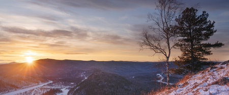 Panoramic photo of the spring mountain valley natural Park Ergaki, Russia. Fabulous sunrise and sunset in the mountains, amazing nature, spring in the mountains. Travel and hike