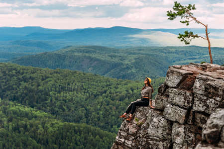 A female traveler is sitting on the edge of a cliff overlooking the forest. Travel as a way of life, adventure, recreation. A traveler on the background of mountains. copy space