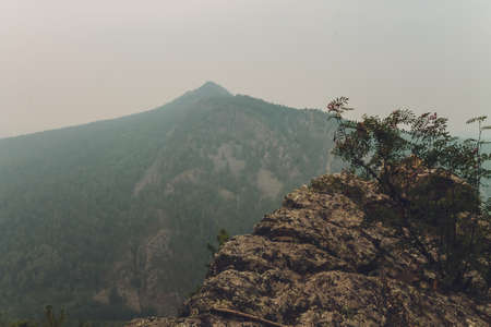 Rocks of Aigir in the smoke of a forest fire. Bashkortostan.
