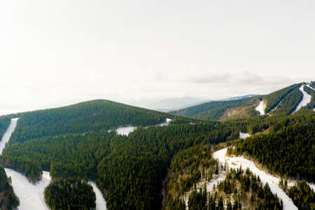 Aerial view of landscape of ski and snowboard slopes through pine trees going down to winter resort in Carpathians.