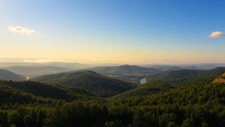 Vast mountain ranges covered in dense forest extend into the distance. Soft clouds scatter across a bright blue sky on a clear day.