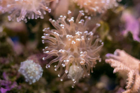 Beautiful sea anemones growing in the aquarium in Germany. Underwater scenery.