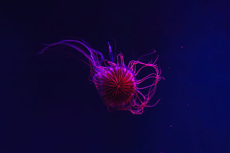 Fluorescent jellyfish swimming underwater aquarium pool with red neon light. The Japanese sea nettle chrysaora pacifica in blue water, ocean. Theriology, biodiversity, undersea life, aquatic organism