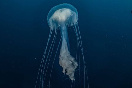 jellyfish underwater, dark background, blue color light, wildlife sea animal, beautiful scene of swimming.