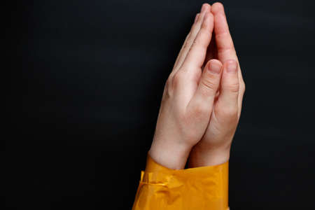 The hands of the man who was clinging to the prayer on the yellow background.Top view