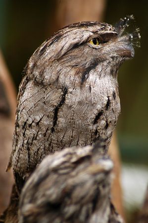 grey australian bird, large yellow eyes, camouflaged to look like a tree branch.