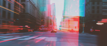 Distorted cityscape with vibrant glitch colors and motion blur effects
