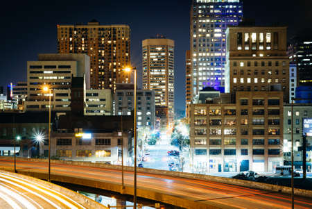 View of the Jones Falls Expressway and buildings in downtown at night, in Baltimore, Maryland.