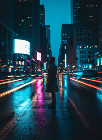 A tranquil urban scene captures a rainy city street lined with tall buildings, where glowing lights reflect in puddles, creating a serene and calm atmosphere.