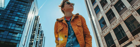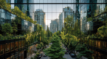 This captivating urban landscape showcases the blend of modern architecture and lush greenery, featuring glass buildings reflecting nature. The scene highlights the harmony between urban life and the environment, demonstrating the importance of integrating green spaces in city design.