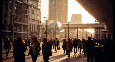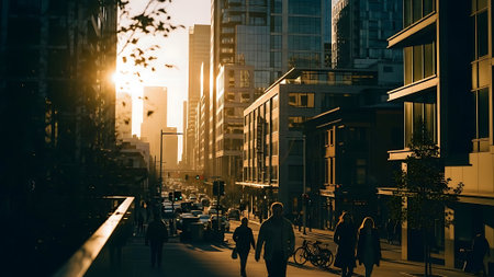 Dynamic silhouettes of walking figures with motion blur amidst urban office skyscrapers