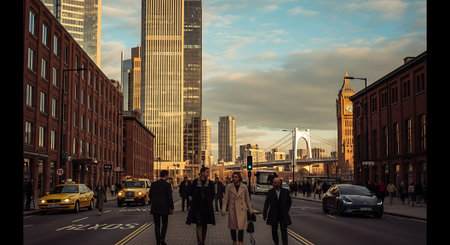 People walking on a busy city street with modern skyscrapers and historic buildings