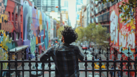 A man leans against a wrought iron fence face obscured as looks out at a busy city street filled with vibrant street art. .
