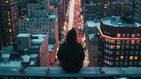 A lone figure sits on a rooftop ledge lost in thought with back to the camera overlooking the bustling city below. .