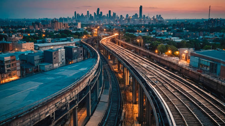 Modern urban industrial landscape with curved train tracks and skyscrapers.