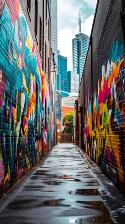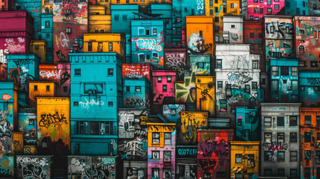 A colorful cityscape with graffiti on the buildings. The buildings are multi-colored and the graffiti adds a sense of urban life and creativity