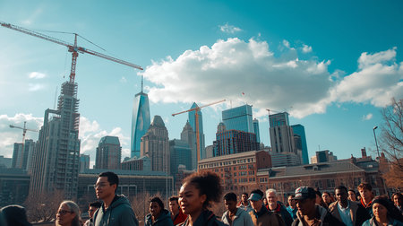 New York City Manhattan skyline panorama with skyscrapers and people.