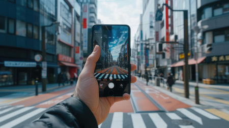 Close up of smart man hand holding camera while record video at japanese road or city street. Attractive people holding telephone or cell phone while recording view as japanese background. AIG42.