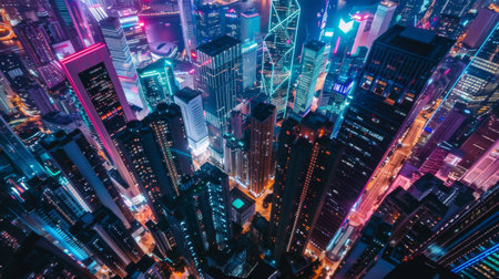 Aerial View of a City at Night With Illuminated Skyscrapers and Busy Streets, Downtown view of a bustling city from a drone's perspective, AI Generated