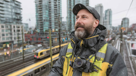 A joyful photographer enjoys the urban landscape while capturing moments in rainy weather. The city skyline and passing train add to the dynamic atmosphere.