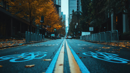 An urban street scene during autumn, featuring vibrant foliage and distinct bicycle lane markings. The calm atmosphere captures a unique city vibe during the fall season.