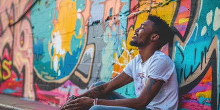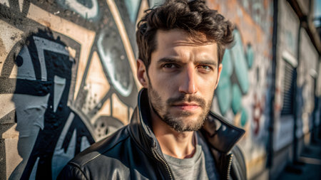Capture a portrait of a man standing against a vibrant graffiti-covered wall