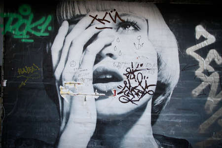 XIMEN, TAIPEI - MAR 8: An urban street art graffiti spray paint wall with sticker bomb in the reckless dirty dark side of Ximending the central of Taipet, Taiwan on March 8, 2017.
