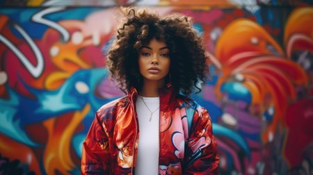 Trendy African American female in a leather jacket posing before a vibrant graffiti wall, embodying urban fashion.