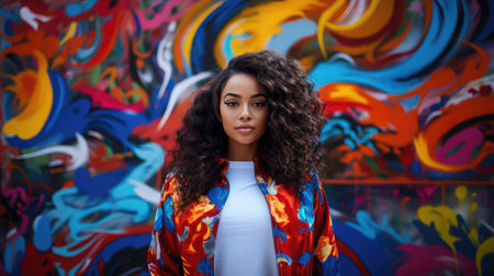 A young urban woman stands in front of colorful graffiti on a brick wall