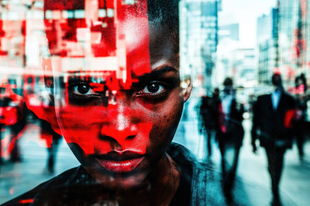 Intense portrait of a model with dark skin against a blurred cityscape, showcasing a mix of emotions and vibrant colors, representing urban life and modernity
