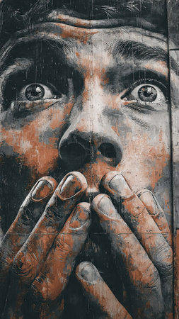 A person clutches their chest, eyes wide, breathing fast, overwhelmed by panic.