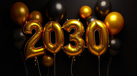 A vibrant display of golden balloons featuring the number 2030 against a dark background, perfect for welcoming the New Year. The arrangement exudes a celebratory atmosphere.