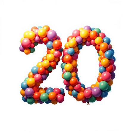 The number 20 is made up of many colorful balloons, creating a festive and celebratory atmosphere on a white background, perfect for a birthday card illustration.