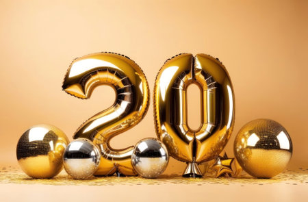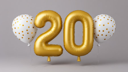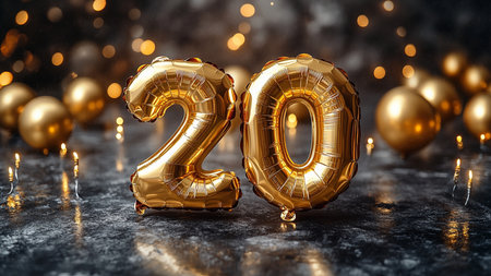 Celebrate in style with this stunning photo of golden '20' balloons and glittery decorations perfect for milestone events! Glam up your special occasion. Stylish Celebration. GoldenVibes. Generated A.I.