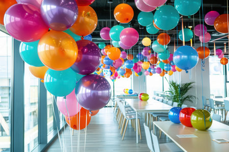 A modern office space is decorated for an event with colorful balloons hanging from the ceiling and arranged on tables.
