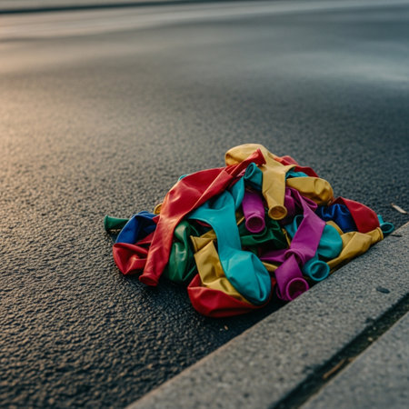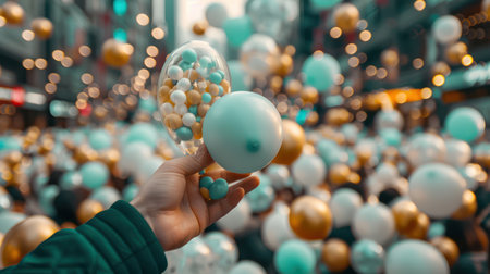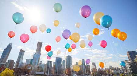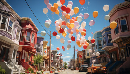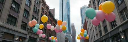 Colorful balloons float above a city street, creating a festive atmosphere in an urban setting