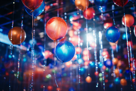 Colorful Christmas party balloons and glitter invitation for With bokeh background, Birthday Celebration flying balloon, confetti, ribbons. Event decoration. New year eve. Copy space