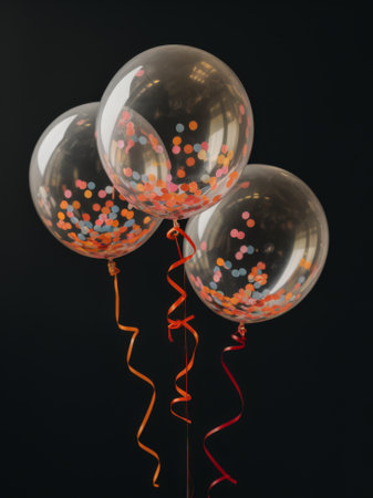 Three transparent balloons filled with colorful confetti hover against a black background, accented by vibrant orange, red, and yellow curling ribbons.