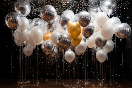 Festive arrangement of gold, white, and confetti-filled balloons against a dark background