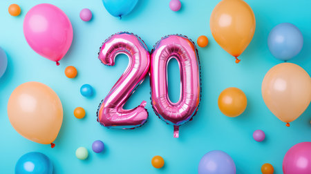 This vibrant image features the playful number 20 in bright yellow, flanked by colorful balloons, set against a soft blue background, perfect for celebrations.