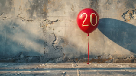 Number 20 in red foil balloon on concrete, creating a stylish anniversary concept, ideal for a celebration banner with a touch of sophistication and copy space