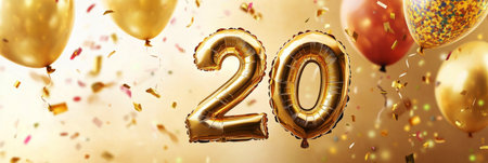 A dazzling gold foil 20 balloon paired with colorful confetti and elegant gold balloons, exuding a celebratory energy, perfect for promoting bright and dynamic event banners