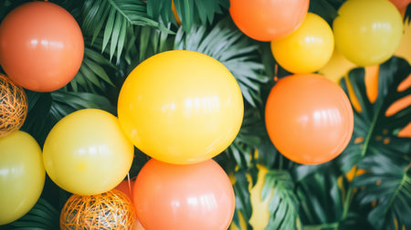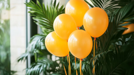 Yellow and orange balloons in a tropical themed birthday room, green plants and beach decor. generative ai