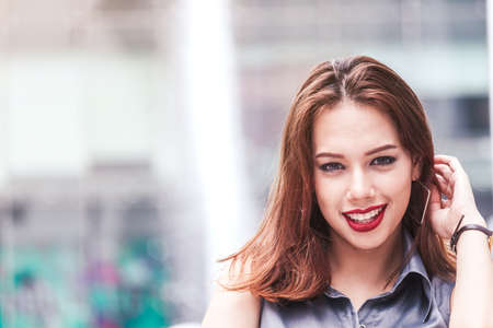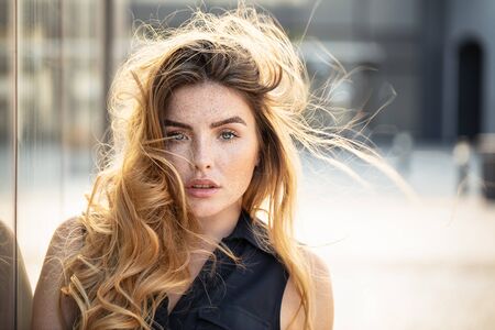 Fresh portrait sensual beautiful young woman with pretty sexy lips with tanned healthy skin in elegant stylish shirt in line on street on windy day. Attractive fashionable girl model outdoors.