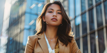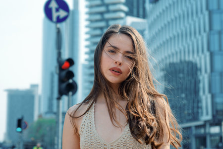 A woman stands confidently with windswept hair gazing towards the camera. The backdrop features a striking urban skyline under a clear blue sky highlighting modern architecture.
