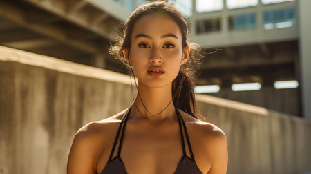 Portrait of a young beautiful Asian woman in black swimsuit posing outdoors.