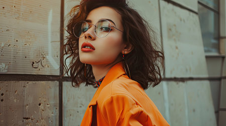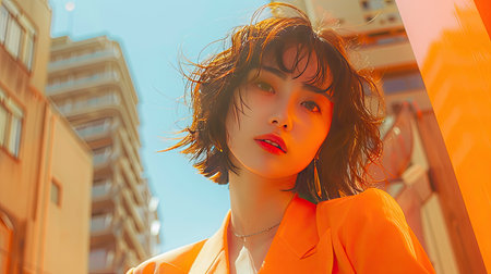 Urban Fashion Portrait of Young Woman in Vibrant Orange Suit with Messy Bob Hairstyle in Sunlit Cityscape