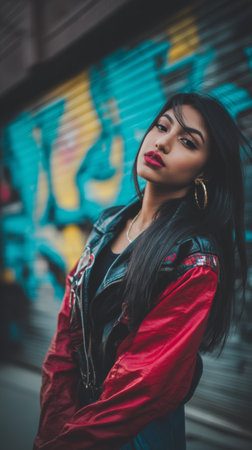 A young woman stands in front of a vibrant mural. She wears a black leather jacket with a red overlay. Her hair flows in the breeze as she gazes at the camera without smiling.