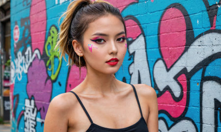 A young woman with bright makeup stands in front of a graffiti wall in the city