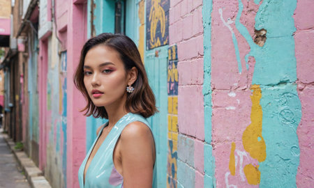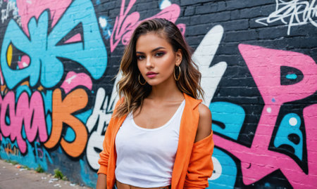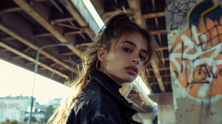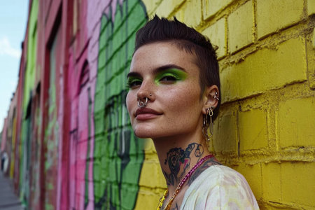 A striking portrait of a young woman showcasing her unique style and piercing gaze, set against a vibrant urban graffiti backdrop. Perfect for capturing contemporary fashion and urban culture.